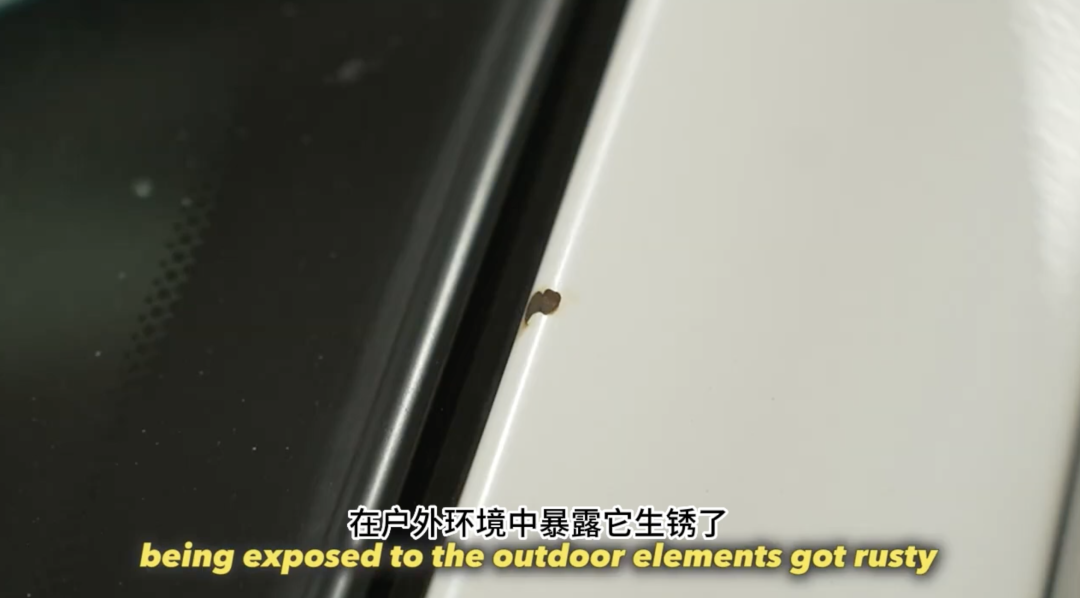 贴膜与未贴膜对比:同样被飞石撞击,贴膜的位置虽然保护膜破损,但车漆依然完好;未贴膜的位置被飞石撞击,导致车漆掉落、斑驳生锈。